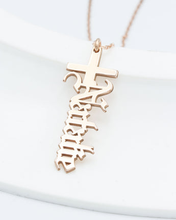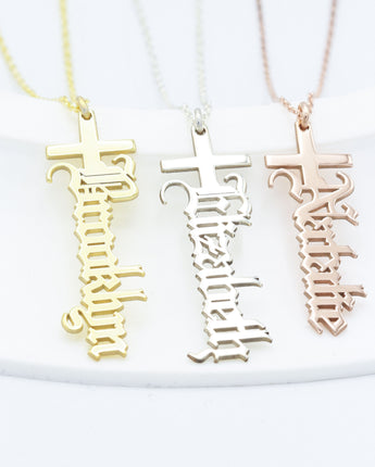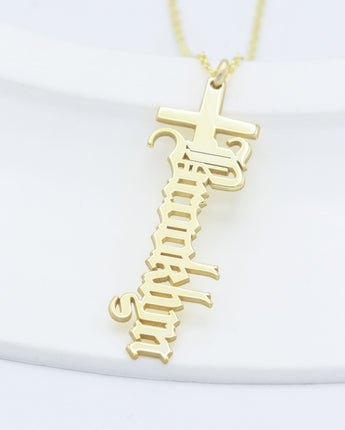 This 925 sterling silver necklace is personalized with your name in Old English font, featuring a beautiful cross pendant. Crafted with quality and care, it's a meaningful accessory that showcases your faith and individuality. Make a statement and elevate your style with this unique and timeless piece.