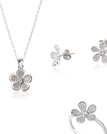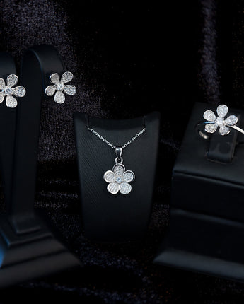 925 Sterling Silver Daisy Shape Jewelry Set 3 Pieces: Necklace, Ring & Earrings