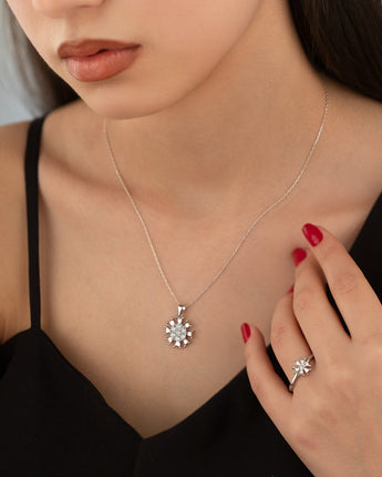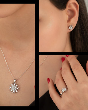 Stone Flower Shape Jewelry Set 3 pieces: Necklace, Ring & Earrings - Valentine's Day Gift - 925 Sterling Silver Jewelry Set - Gift for Her - Handmade Pendant - Gift for Wife