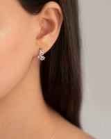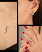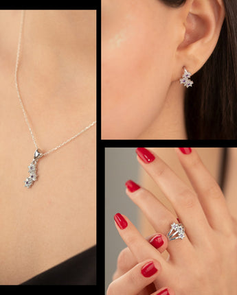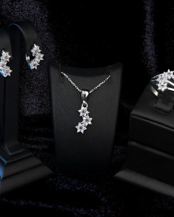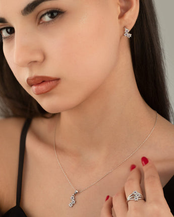 925 Sterling Silver Three Stone Daisy Shape Set 3 Pieces: Necklace, Ring & Earrings
